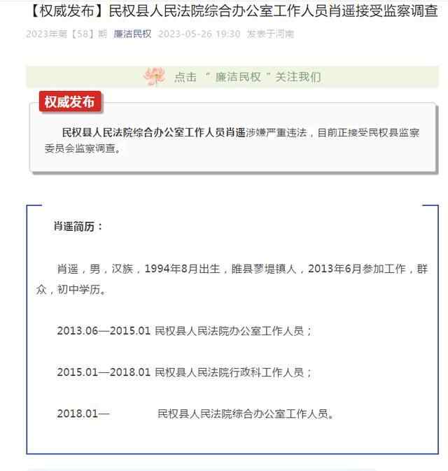 公开资料显示,肖遥出生1994年8月,睢县蓼堤镇人,2013年6月参加工作,政治面貌为群众,仅有初中学历。自工作以来,他先后担任民权县人民法院办公室工作人员、行政科工作人员以及综合办公室工作人员。