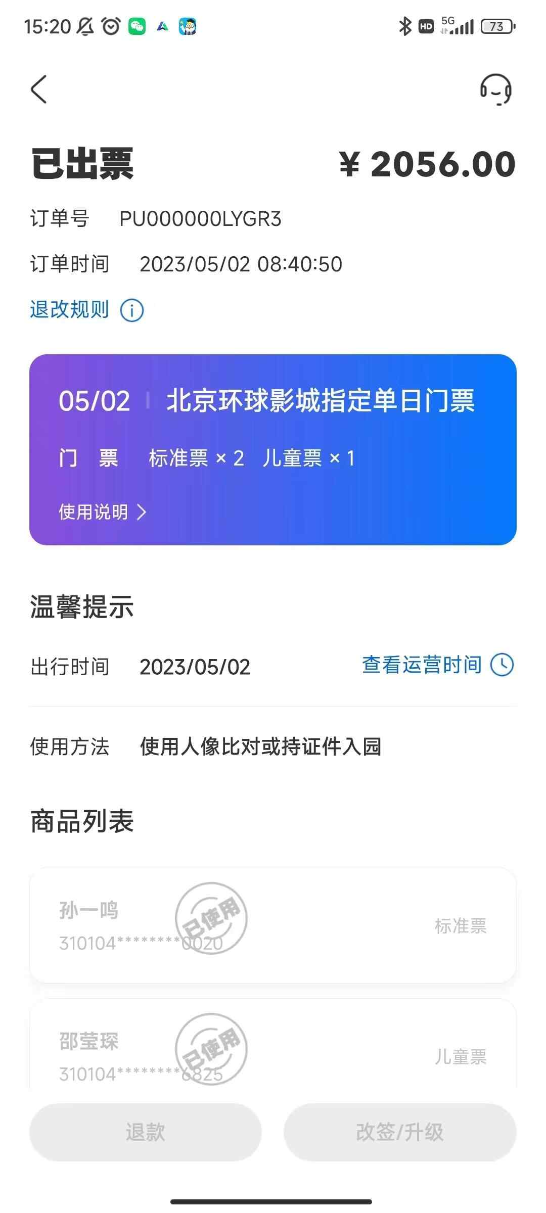 孙女士介绍,4月24日,她购买了3张北京环球影城的两日联票,包含两张成人票和一张儿童票,共计3220元,并在线预约了5月1日和5月2日入园。