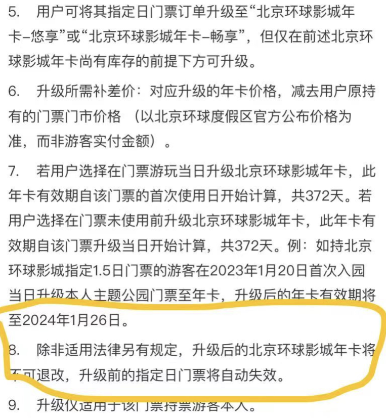 近日,消费者孙女士向记者反映,4月24日她购买了三张北京环球影城的两日联票,并预约了5月1日、2日入园。1日入园后,她得知可以将门票升级为年卡,随即花费1271元办理了升级,但没想到次日入园被告知升级后原本购买的两日联票和预约均作废,而5月2日不属于年卡预约时间,想入园只能再另外购买当日门票。