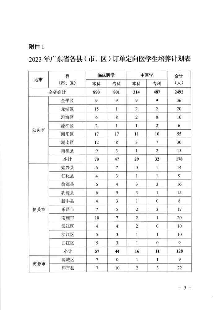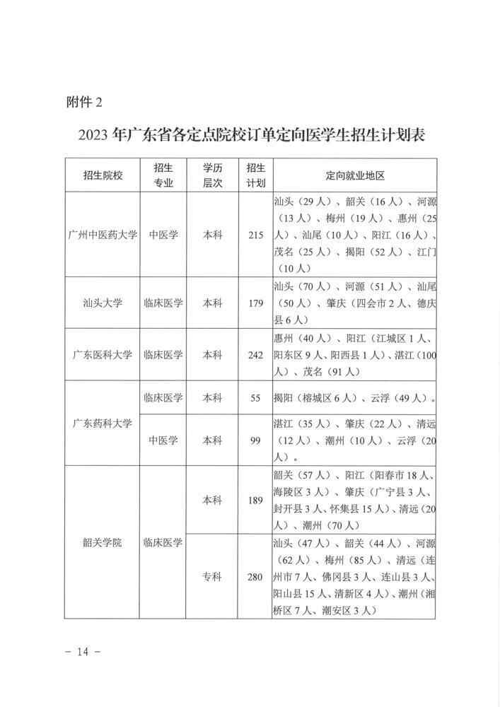 2023年,接收订单定向培养医学大学生的有汕头、韶关、河源、梅州、惠州、汕尾、阳江、湛江、茂名、肇庆、清远、潮州、揭阳、云浮、江门等地市。