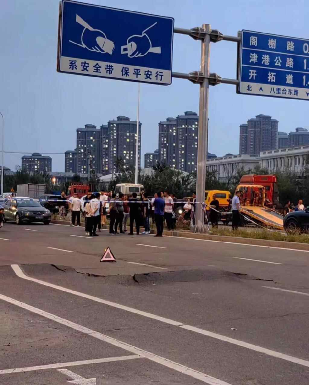 5月31日晚,天津市津南区八里台镇碧桂园东门八里台路地面发生波浪状凸起,路面胀开,附近高层住宅楼也出现开裂下沉,居民部分撤离的消息在网上流传。
