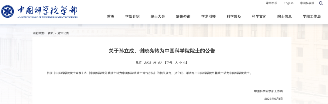 6月2日,中国科学院学部官网发布了《关于孙立成、谢晓亮转为中国科学院院士的公告》:根据《中国科学院院士章程》和《中国科学院外籍院士转为中国科学院院士暂行办法》的相关规定,孙立成、谢晓亮由中国科学院外籍院士转为中国科学院院士。
