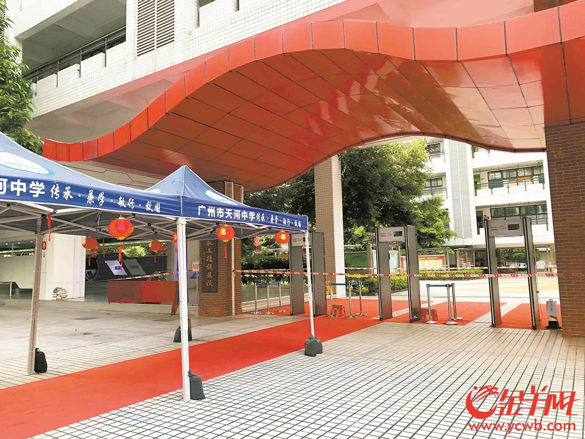 记者在广州市天河中学考点采访了解到,学校高一高二学生已于5日下午离开校园,学校正紧锣密鼓地进行考前准备。因夏日高温多雨,学校在入口处贴心设置了遮阳遮雨棚,上面挂着学弟学妹们为高三考生手写的祝福。学校还特意铺上了红毯,道路尽头,考生将通过智能安检门和金属探测仪的检测后进入考点,另有更衣室、高考心灵加油站以及大件物品存放处供有需要的考生使用。