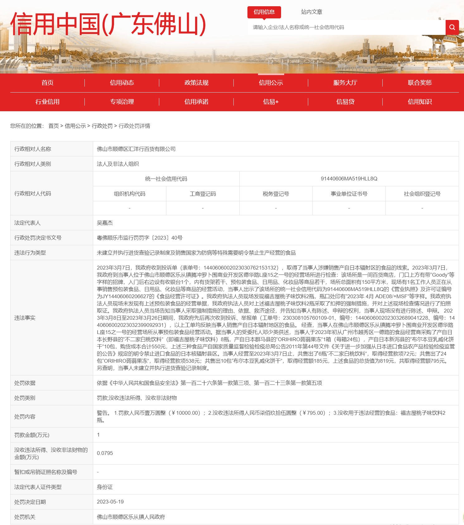 据“信用中国”消息,佛山市顺德区一家百货公司近日因出售明令禁止进口的日本核辐射县区食品,被有关部门处罚一万元。目前,部分涉事食品已流入市场。
