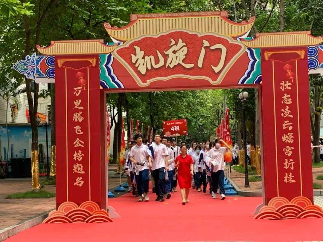 6月7日,广州市天河中学。2020届4班学生在老师的带领下高喊口号,通过学校特意设置的“凯旋门”前往考场。(记者 王沫依)