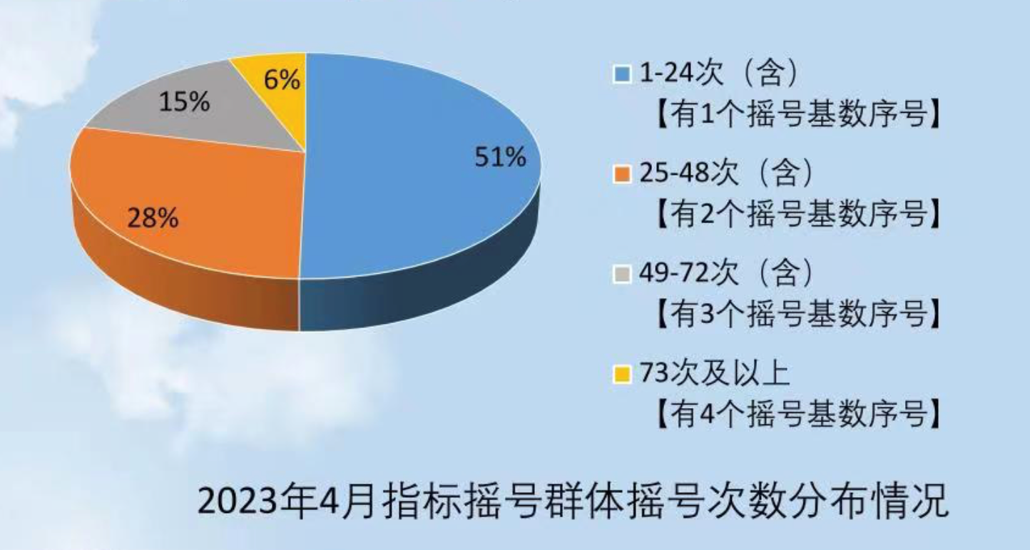 广州市交通运输部门在延长通告的解读中表示,《阶梯摇号通告》实施以来,累计摇号次数超过24次的“久摇不中”群体实际中签率提高,基本达到兼顾摇号公平和效率的目的。以2023年4月个人普通车增量指标摇号为例,参与总人数约52.2万人,配置指标4500个,拥有1、2、3、4个基数序号的人数分别约为26.3万人、14.8万人、8.0万人、3.1万人,对应中签概率分别为0.49%、0.98%、1.46%和1.95%。
