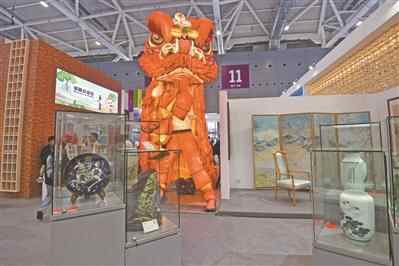 文博会现场,一座醒狮灯箱前展示着多种工艺品。@视觉中国