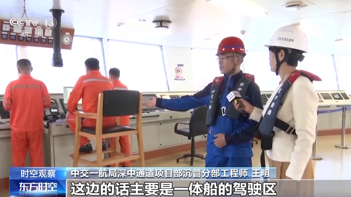 记者:我们现在是在一体船船头的位置,甲板有两个足球场大。向下看,最后一节沉管和最终接头已经和一体船紧紧连在了一起。向上看,甲板的四周,都是用于浮运安装的机械设备。一体船4层的指挥中心,相当于一体船的大脑。