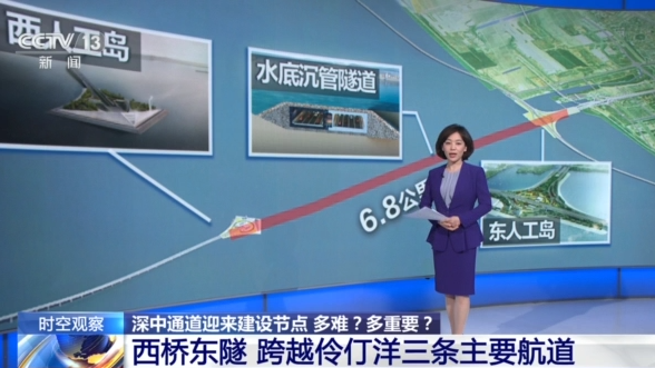而靠近深圳的东段则选择了水底沉管隧道的建设方式,从第三条航道的水下穿过。因此,在整个通道穿行水下的东西两端,各建有一个人工岛。其中,靠近深圳前海的东人工岛还建有水下互通设施,可以直接连通机场。