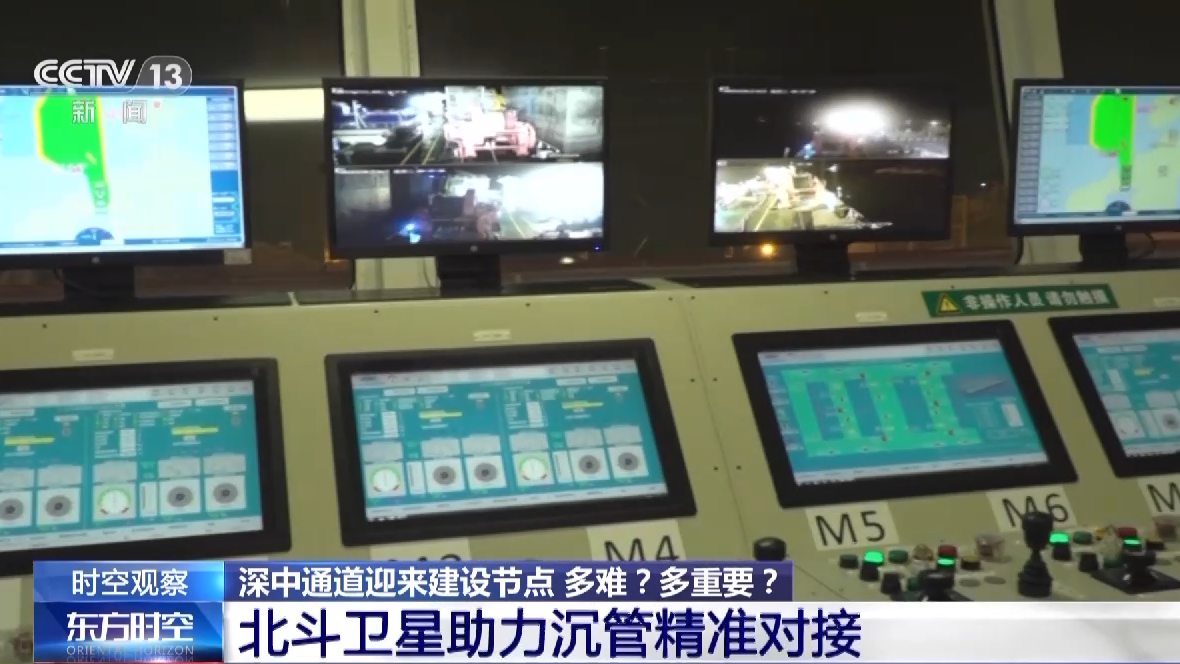 中交一航局深中通道项目部沉管分部工程师 王明:目前的这个界面就是管节安装的测控系统界面,通过这个界面我们实时看到这个管节的一个四角坐标,通过这个四角坐标来指导管节的一个精准对接,那么这个四角坐标的实时显示的话,是通过正前方的这个测量塔系统,我们在测量塔顶部安装北斗卫星的一个接收天线,通过北斗卫星的接收天线与管顶的特征点建立相对位置关系,进一步显示管节在水下的一个姿态。