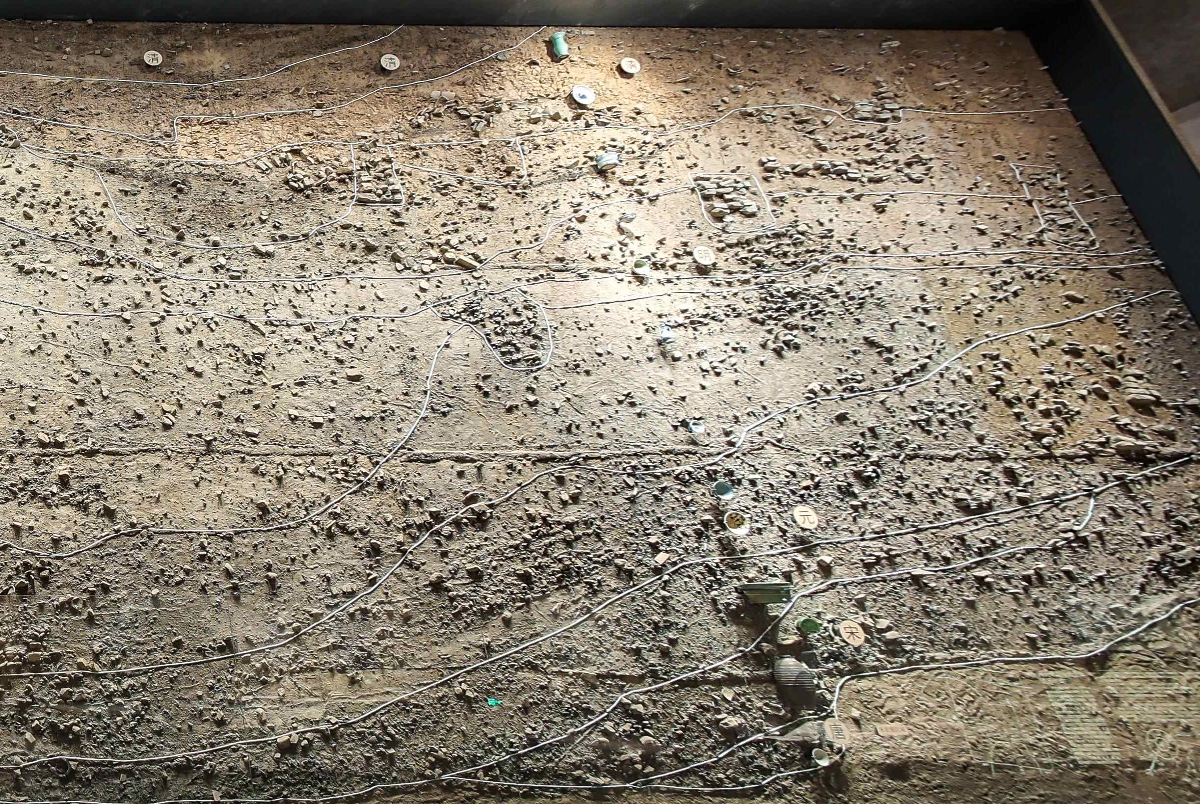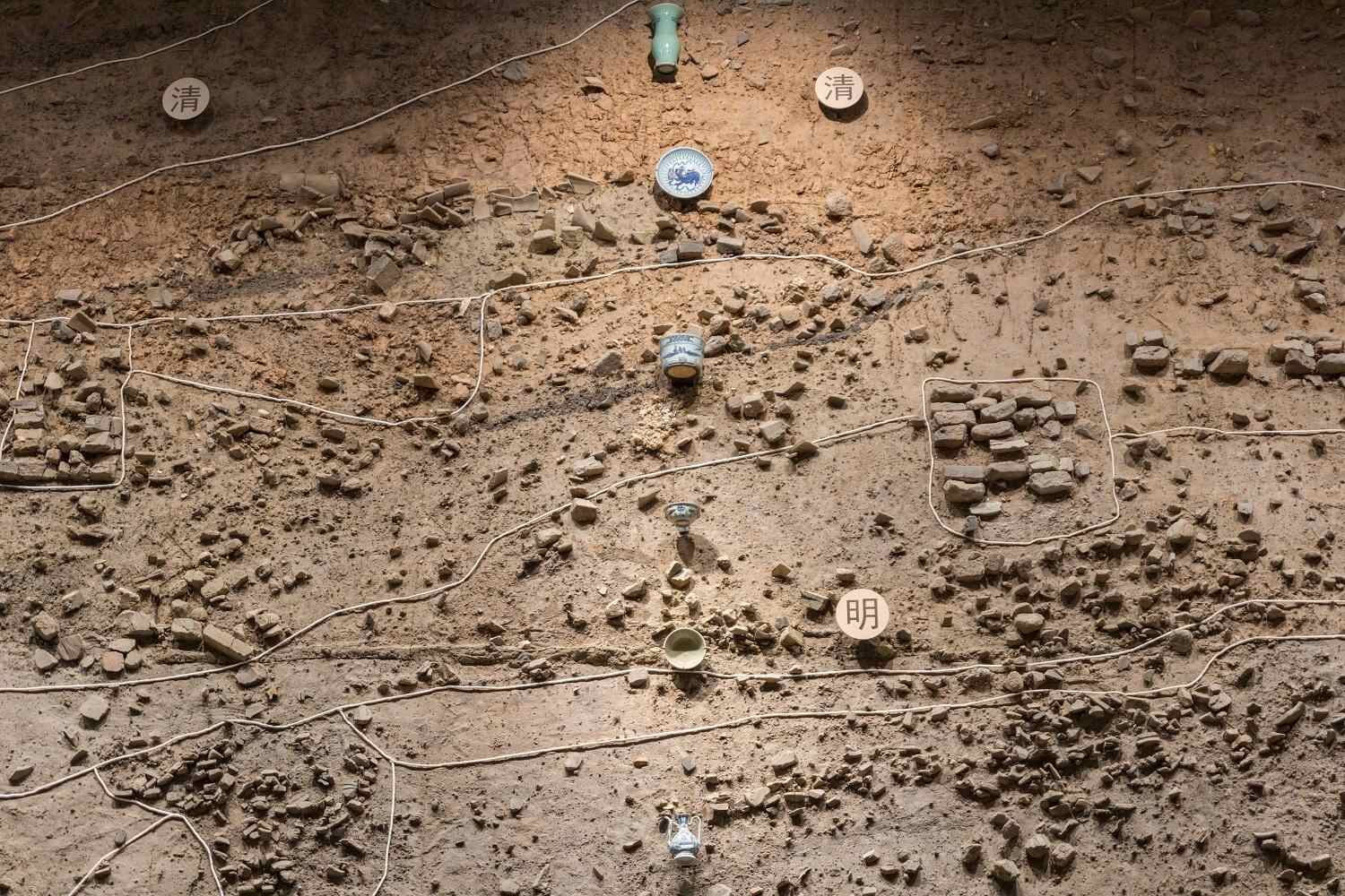 △利用白线绳区分出汴河剖面各层所属的朝代。