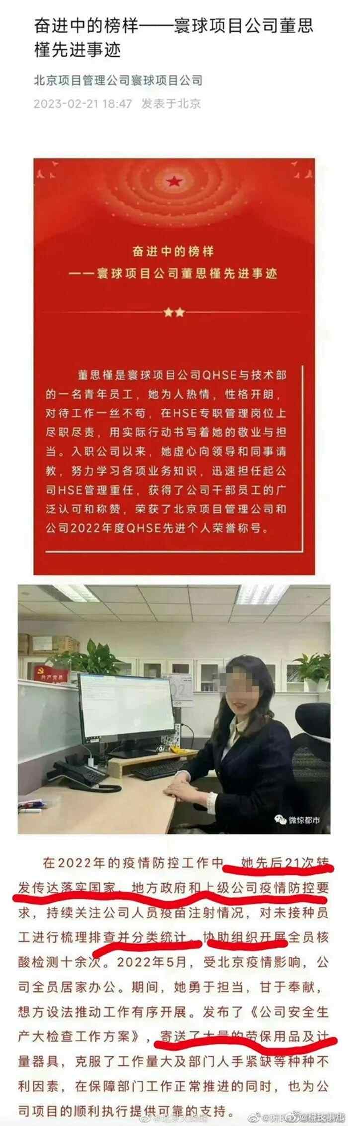 在2月份,“北京项目管理公司寰球项目公司”公众号发布的《奋进中的榜样——寰球项目公司董思瑾先进事迹》一文中称,董某某评为公司2022年度QHSE先进个人荣誉称号。