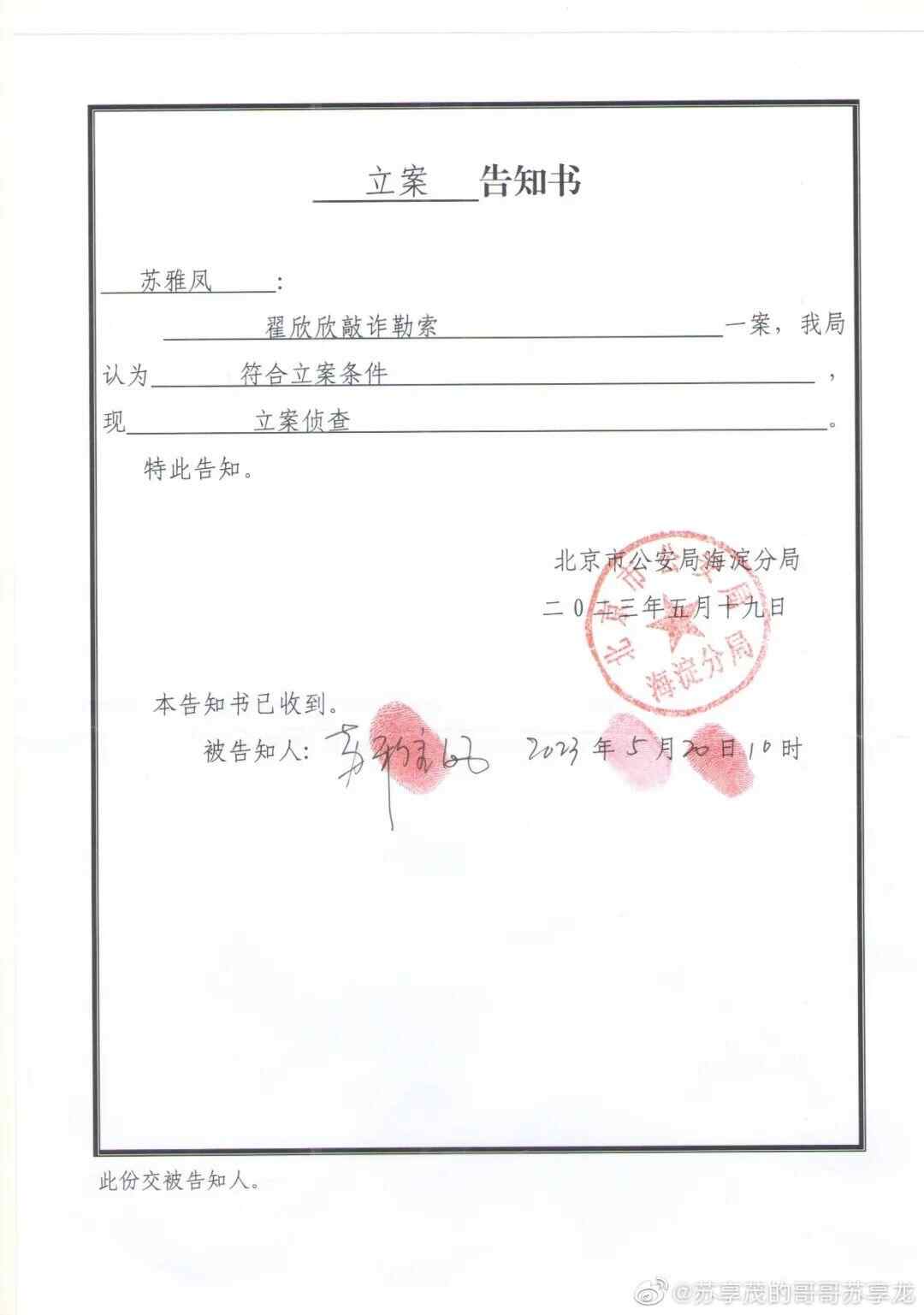 事发5年多之后,2023年6月9日,苏享茂的哥哥苏享龙的个人微博发帖称,翟欣欣已被逮捕,羁押在看守所。苏享龙提供的加盖北京海淀区公安局公章的立案通知书显示,翟欣欣敲诈勒索一案,该局认为符合立案条件,现立案侦查。