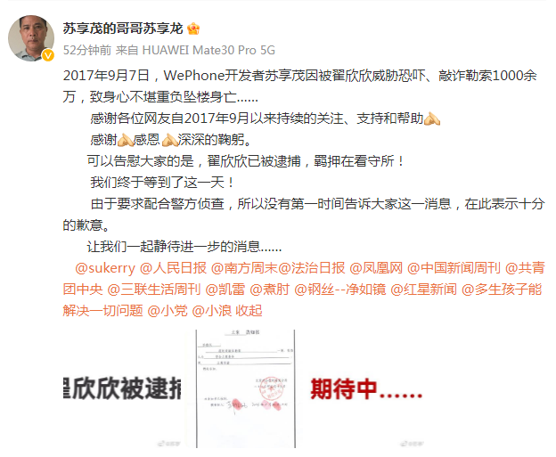 据红星新闻此前报道,2017年9月7日凌晨,手机应用wephone的创始人苏享茂跳楼身亡,并留下遗书称自杀与前妻翟欣欣有关。