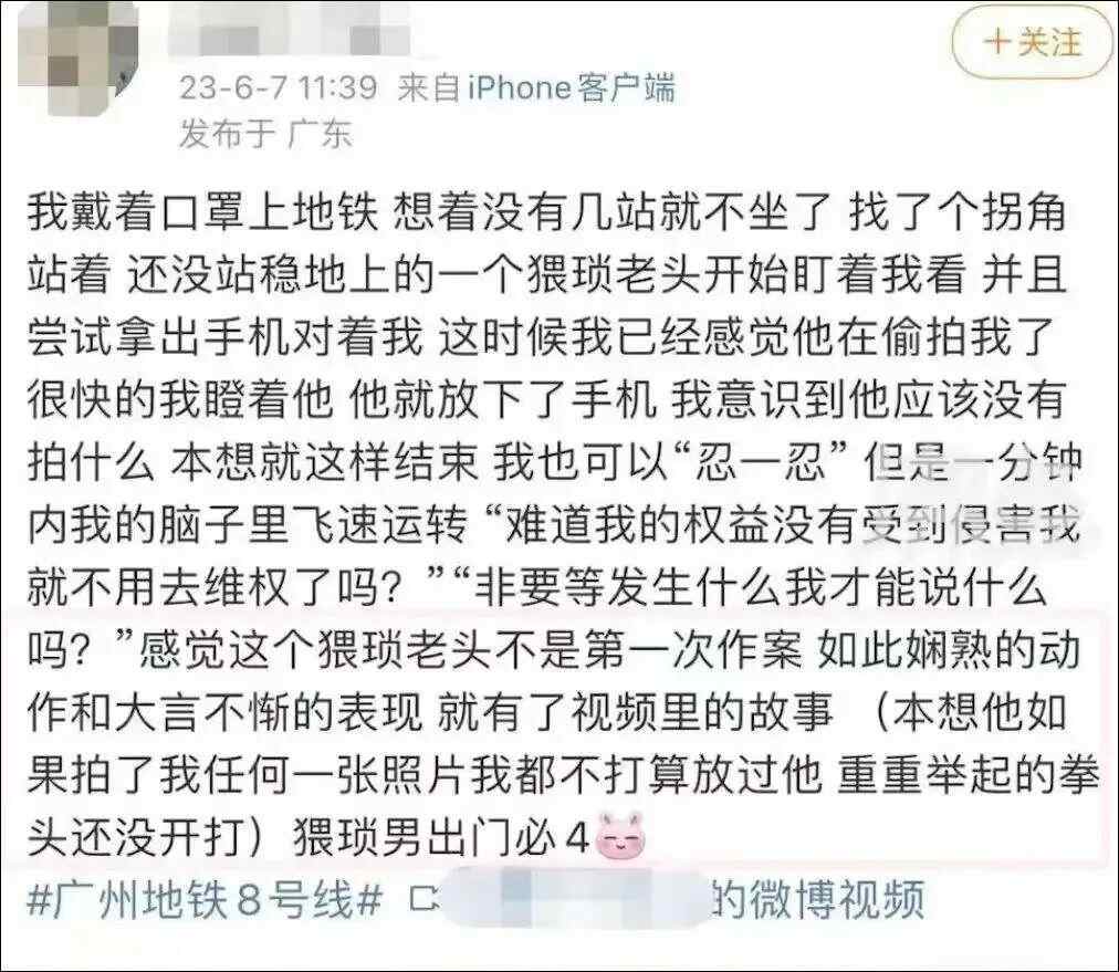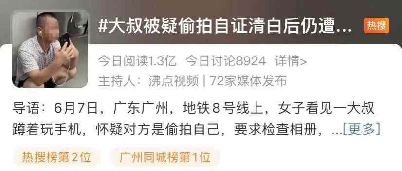6月7日,一段网传拍摄自广州地铁8号线的视频广为流传。视频中,一女子看见一中年男子蹲着玩手机,怀疑对方是偷拍自己,要求检查相册。中年男子同意让女子检查相册自证清白。发现相册中并没有任何偷拍的照片之后,该女子仍旧警告大叔说:“小心点啊,别乱拍。”