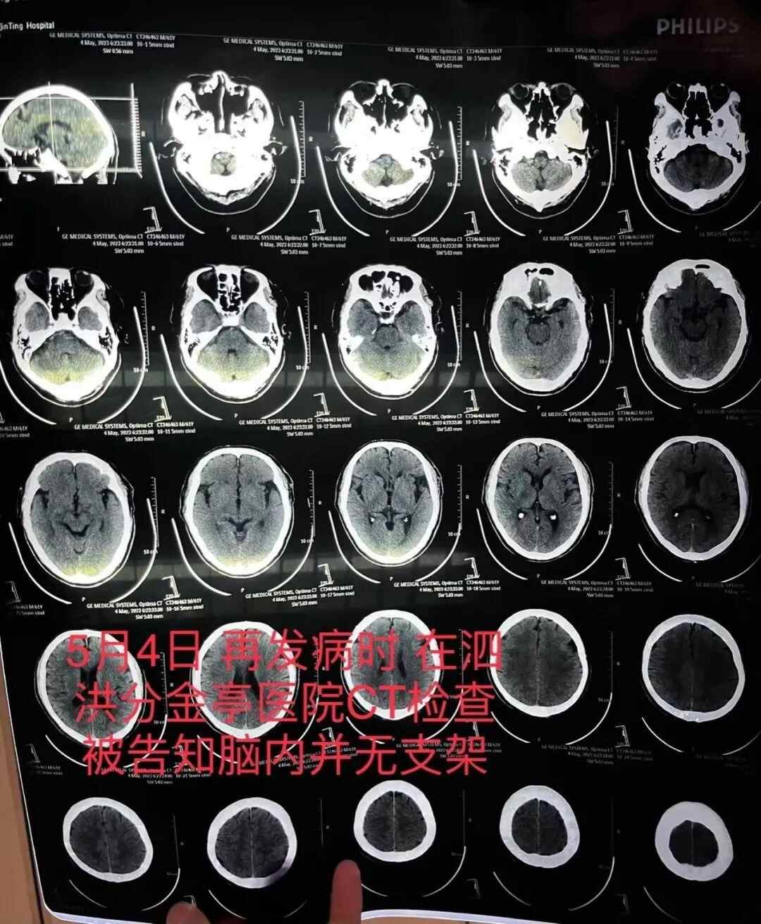 朱老汉在泗洪县分金亭医院的CT检查报告显示颅内并无支架 朱先生供图