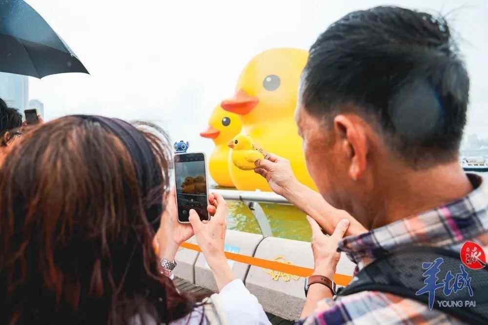 不少市民一大早便前来打卡,许多游客更是慕名前来,带着大黄鸭的模型打卡拍照。