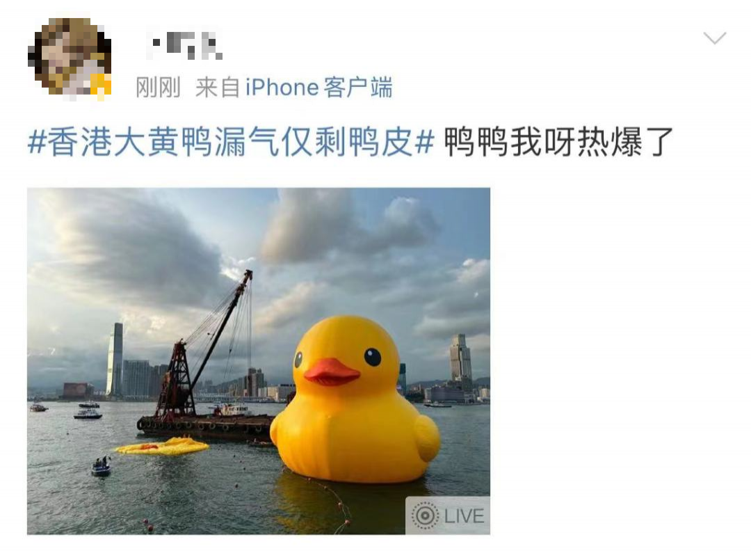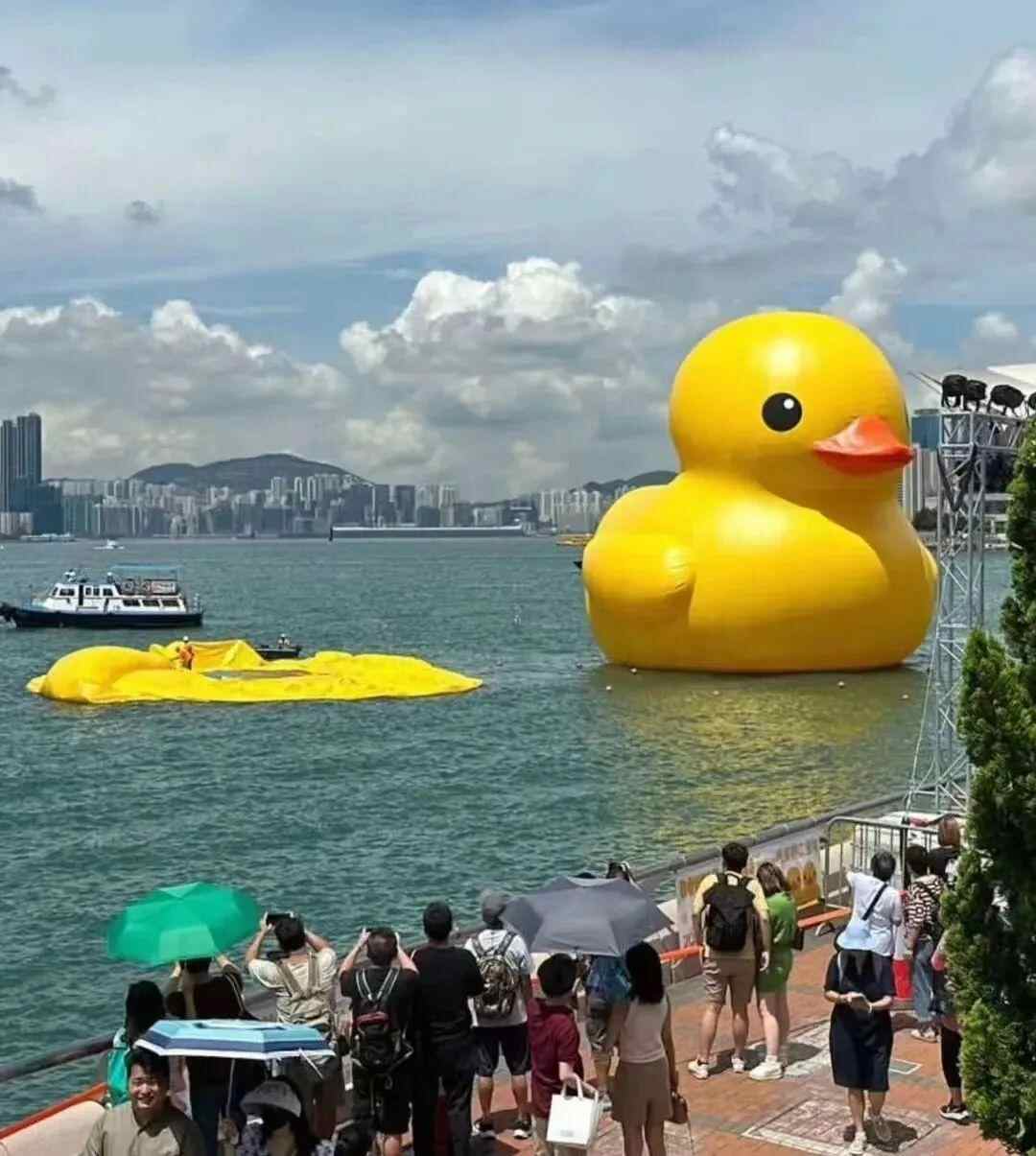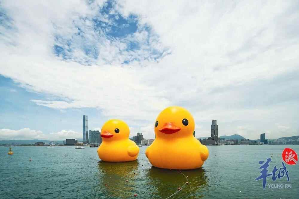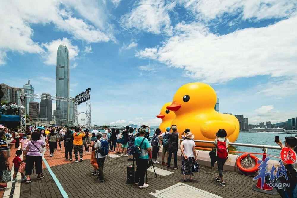 时隔10年,大黄鸭再次返港,6月10日上午,为期两周的大型海上公共艺术展《橡皮鸭二重畅》在香港维多利亚港添马公园海面正式展出。