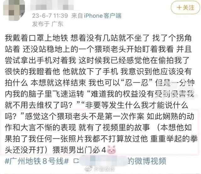 6月7日,广东广州地铁8号线上,一女子看见一大叔蹲着玩手机,怀疑对方是偷拍自己,要求检查相册。在大叔同意让她检查相册并自证清白后,该女子仍在网络曝光大叔是猥琐男,称手法娴熟不是第一次作案,并表示既然没有偷拍,那他为什么不为自己发声。