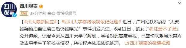 近日,广州地铁8号线“大叔被疑偷拍自证清白后仍被曝光”事件引发关注。6月11日,该女子@注册不了张z 公开道歉。记者今天从四川大学了解到,学校对此高度重视,已密切联系属地警方及当事学生了解核实情况,将按程序依规依纪处理。