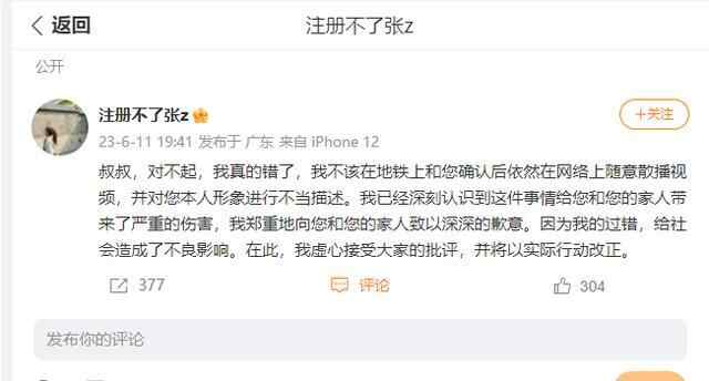 叔叔,对不起,我真的错了,我不该在地铁上和您确认后依然在网络上随意散播视频,并对您本人形象进行不当描述。我已经深刻认识到这件事情给您和您的家人带来了严重的伤害,我郑重地向您和您的家人致以深深的歉意。因为我的过错,给社会造成了不良影响。在此,我虚心接受大家的批评,并将以实际行动改正。