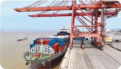 浙江省玉环市通过整合港口仓储、外贸、集装箱运输等多种业务类型,增强港口对RCEP国家的辐射能力。图为大麦屿港码头的工人正忙着将集装箱载入开往日本大阪等地的货轮。段俊利摄(人民视觉)