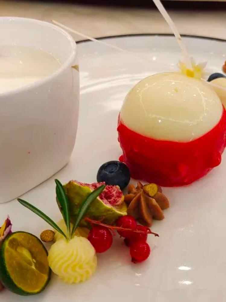 新派荔茸香酥鸭,鸭肉加上芋泥、荔枝果肉,口感层次丰富,口味清新。除了热菜外,皇朝酒店还推出一系列荔枝甜品,如荔枝玫瑰提拉米苏、红酒荔枝软欧、荔枝巴斯克、荔枝慕斯蛋糕、自制荔枝酸奶、荔枝燕窝等。