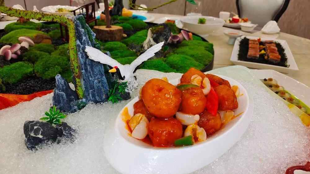 在仙村镇皇朝御苑酒店内,厨师将荔枝融入各种食材之中,运用传统与现代中西式相结合的烹饪技法,烹饪出主味突出、装盘精美、色香味俱全的荔宴全席。