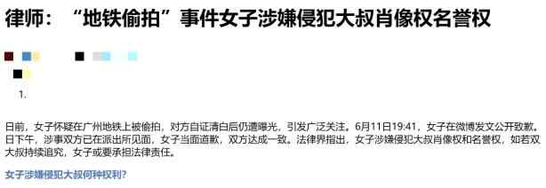 广州地铁8号线“大叔被疑偷拍自证清白后仍被曝光”事件引发关注。除了对当事人是否“过度维权”的讨论之外,也有律师接受媒体采访时表示,该女子的行为涉嫌侵犯了大叔的肖像权。