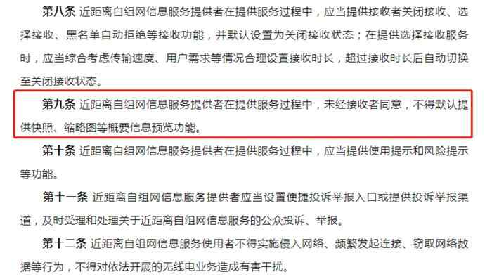 征求意见稿还提出,近距离自组网信息服务提供者在提供服务过程中,应当提供接收者关闭接收、选择接收、黑名单自动拒绝等接收功能,并默认设置为关闭接收状态。