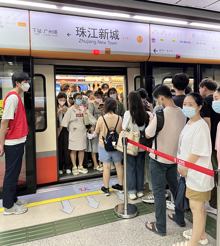 数据显示,广州地铁3号线单日客运量长期位居广州地铁首位,2月17日当天客运量突破200万人次,远超2号线、5号线当天客运量的122万人次、119万人次。与此同时,由于广州地铁3号线途经白云机场、广州东站、天河客运站、珠江新城、华师、广州塔、汉溪长隆等重要站点,不仅连接了重要的交通枢纽,还连通了旅游打卡地、知名高校等人流聚集地。在这一背景下,三号线每天早晚高峰时间,站台、车厢处处挤满了乘客,通行场面相当壮观,一度被网友们戏称为“宇宙最堵三号线”。