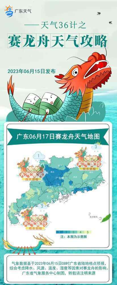 预计17日至18日,广东南部沿海、珠三角北部、韶关清远的部分地方仍有“龙舟水”天气,龙舟竞渡依旧要谨慎;除上述区域外,预计17日至18日广东其余大部分地方的天气较适宜龙舟竞渡,但不排除天气炎热紫外线强,建议龙舟竞渡参与者和现场观众备好遮阳帽、墨镜,涂抹防晒霜。