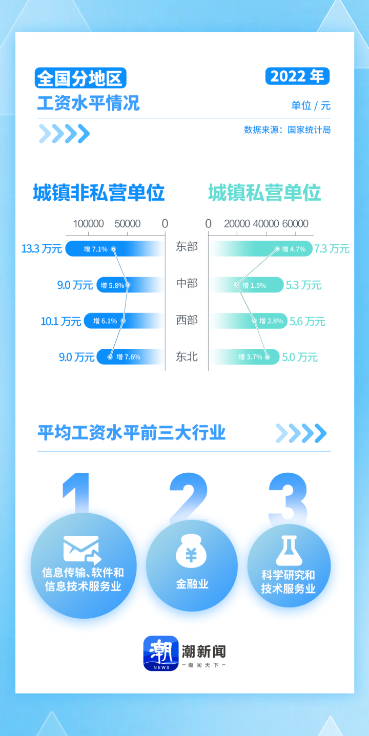 从城镇非私营单位看,东部、中部、西部和东北地区年平均工资分别为13.3万元、9.0万元、10.1万元和9.0万元,分别增长7.1%、5.8%、6.1%和7.6%。