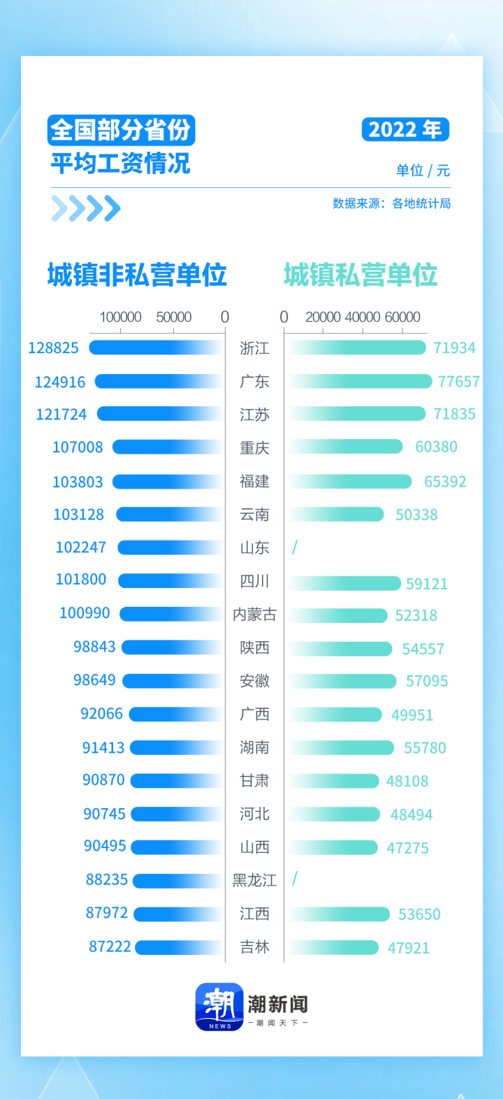 据潮新闻梳理,截至目前,已有浙江、广东、江苏、重庆、福建、云南、山东、四川、内蒙古、陕西、安徽、广西、湖南、甘肃、河北、山西、黑龙江、江西、吉林19个省份公布了2022年平均工资数据。