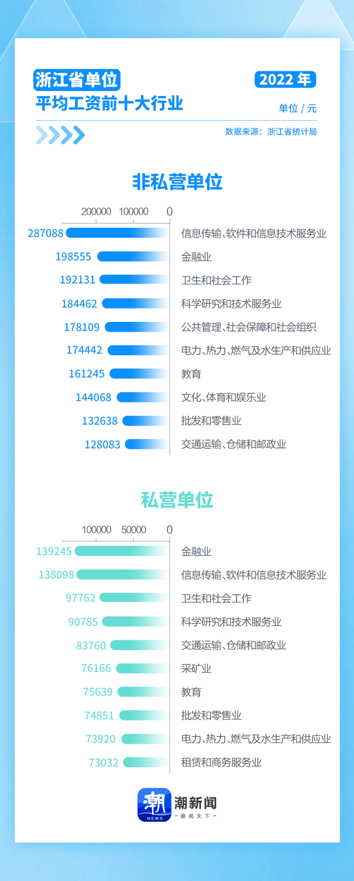 浙江统计局的数据显示,2022年浙江非私营单位就业人员年平均工资为128825元,比2021年度增加6516元,增长5.3%,扣除价格因素,实际增长3.1%;私营单位就业人员年平均工资为71934元,比上年增加2706元,增长3.9%,扣除价格因素,实际增长1.7%。