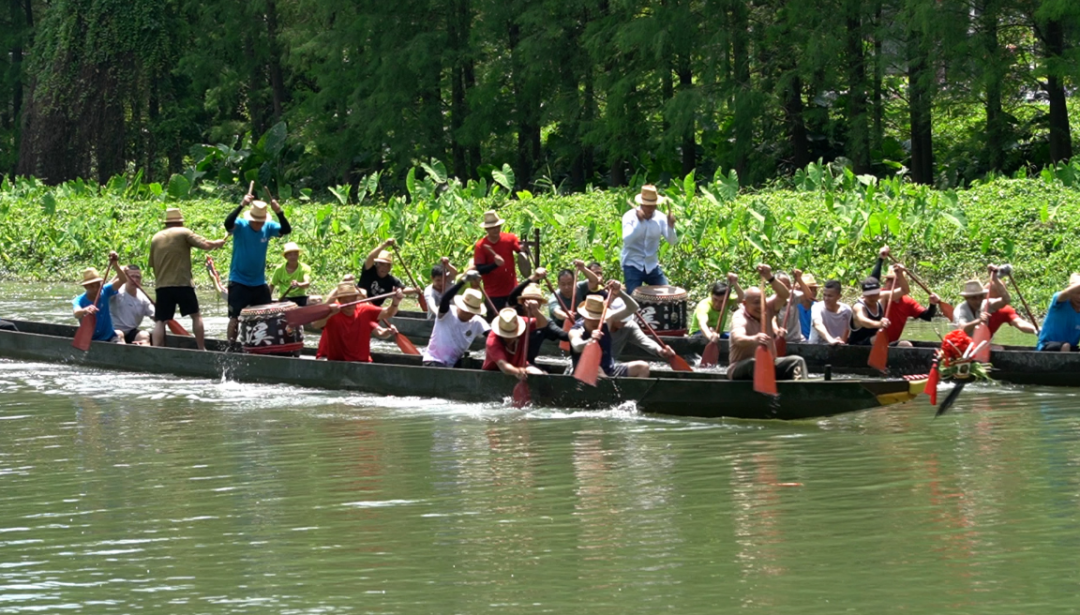 6月24日(农历五月初七)龙岐村、福涌村、南郊村、西郊村等龙舟队在渡头北海景进行游龙展示。