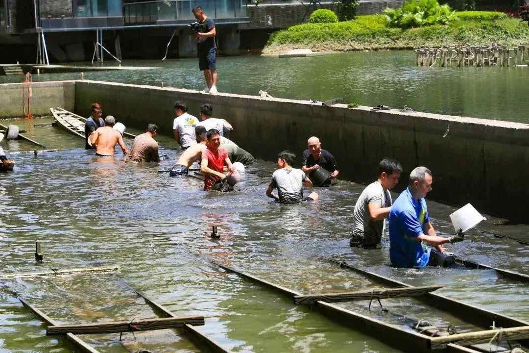 农历四月初八上午,广州荔湾区泮塘村在荔湾湖公园内“龙船窦”进行“起龙船”仪式。