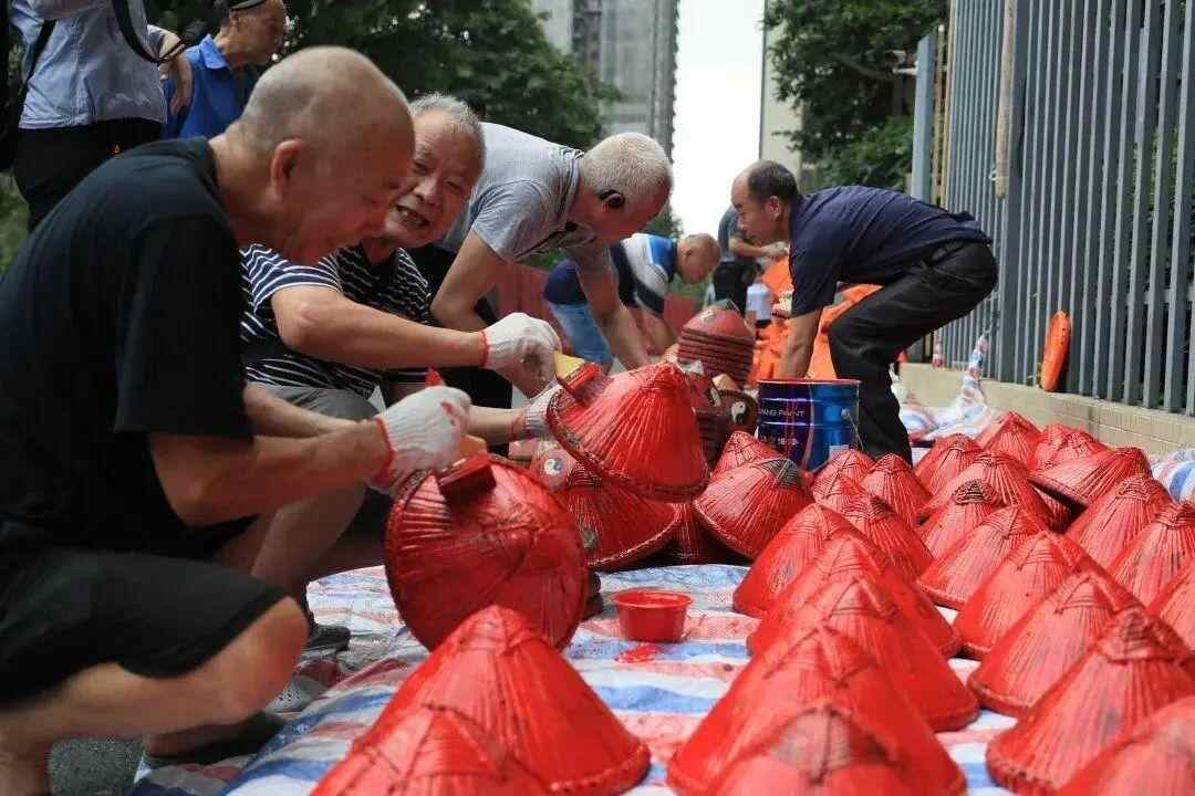 “起龙”当天,现场除了起龙船,文冲村民还用红油漆给自清代就传承下来的龙舟帽——“竹煞帽”上色。