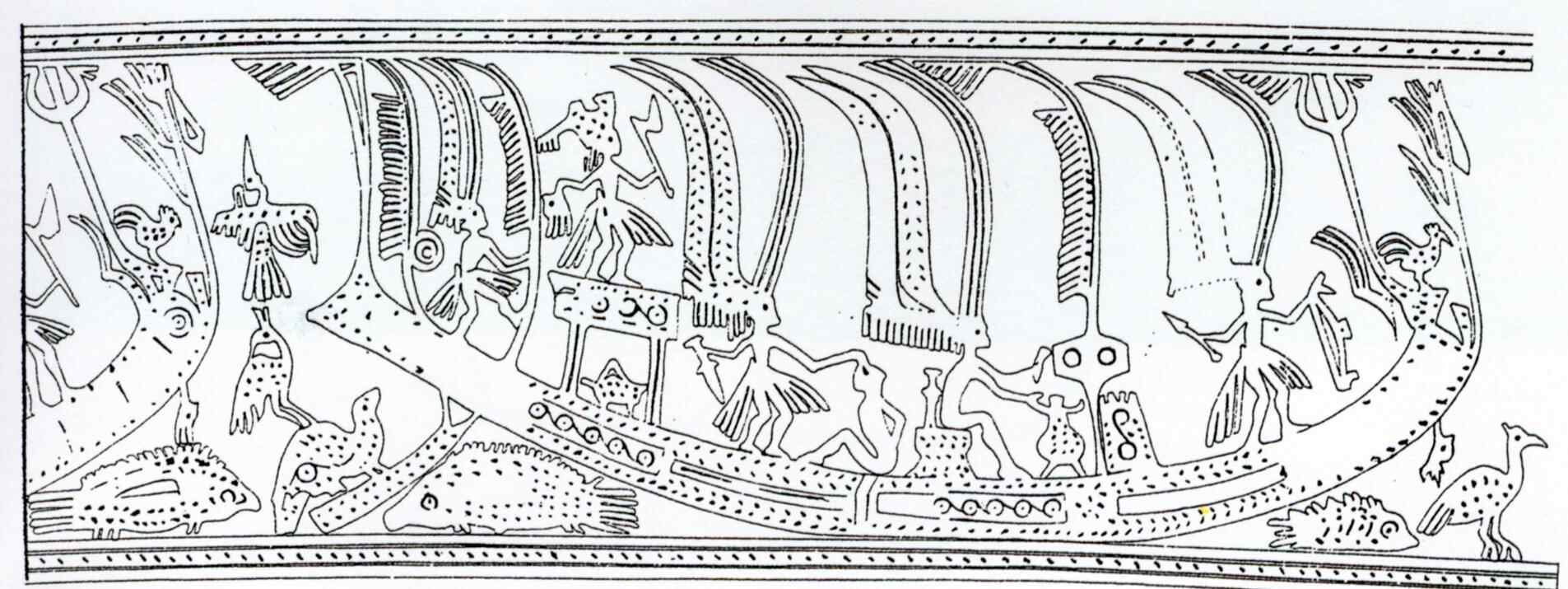 该提筒腰部刻有一组船纹图案,图中有一艘华丽的船,头尾高翘,船上有羽人舞蹈,桨手划桨,与现代“扒龙舟”活动相类似。