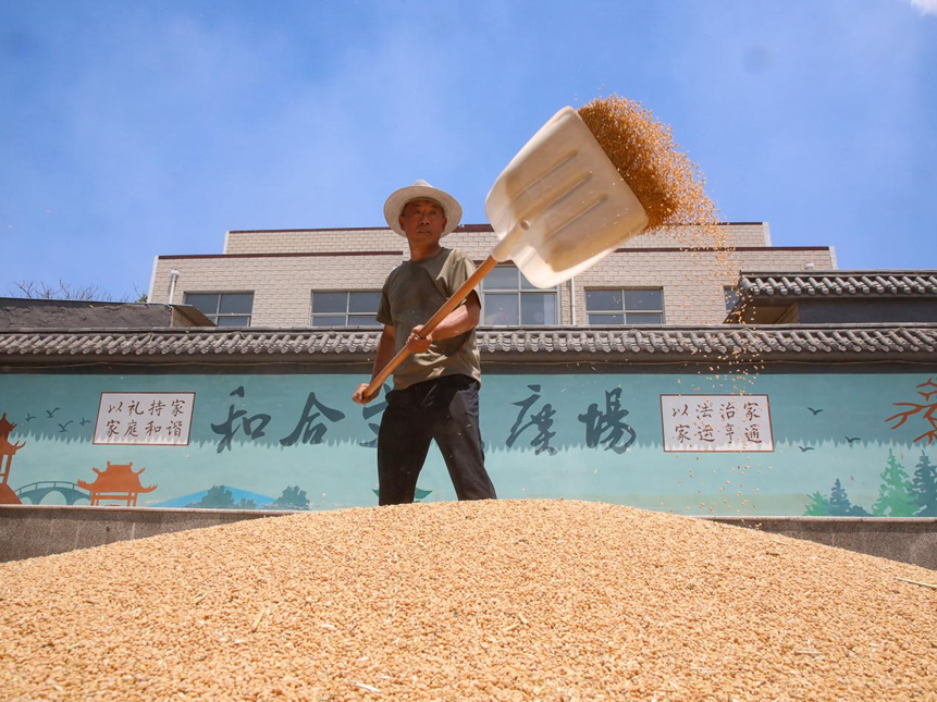 河南省安阳市滑县瓦岗寨乡政府院内铺满了正在晾晒的小麦。新华社发(李亚超 摄)