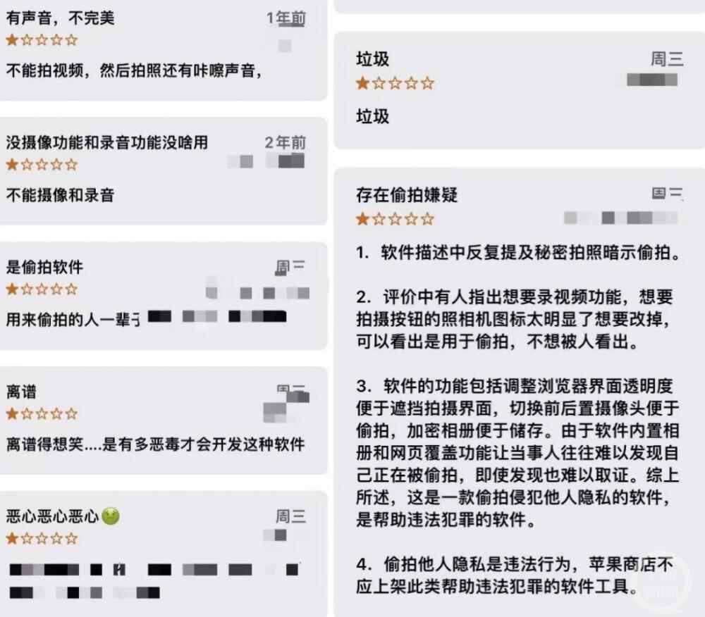 更有人质疑“存在偷拍嫌疑”,并列出4点理由:“1.软件描述中反复提及秘密拍照暗示偷拍。2.评价中有人指出想要录视频功能,想要拍摄按钮的照相机图标太明显了想要改掉可以看出是用于偷拍,不想被人看出。3.软件的功能包括调整浏览器界面透明度便于遮挡拍摄界面,切换前后置摄像头便于偷拍,加密相册便于储存。由于软件内置相册和网页覆盖功能让当事人往往难以发现正被人偷拍,即使发现也难以取证。综上所述,这是一款偷拍侵犯他人隐私的软件,是帮助违法犯罪的软件。4.偷拍他人隐私是违法行为,苹果商店不应上架此类帮助违法犯罪的软件工具。”