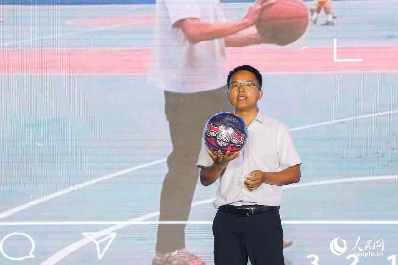 手拿代表吉祥如意的特色篮球,从大山中走来的贵州省黔东南州台江县台盘村驻村第一书记张德介绍了“村BA”的乡土基因。人民网摄