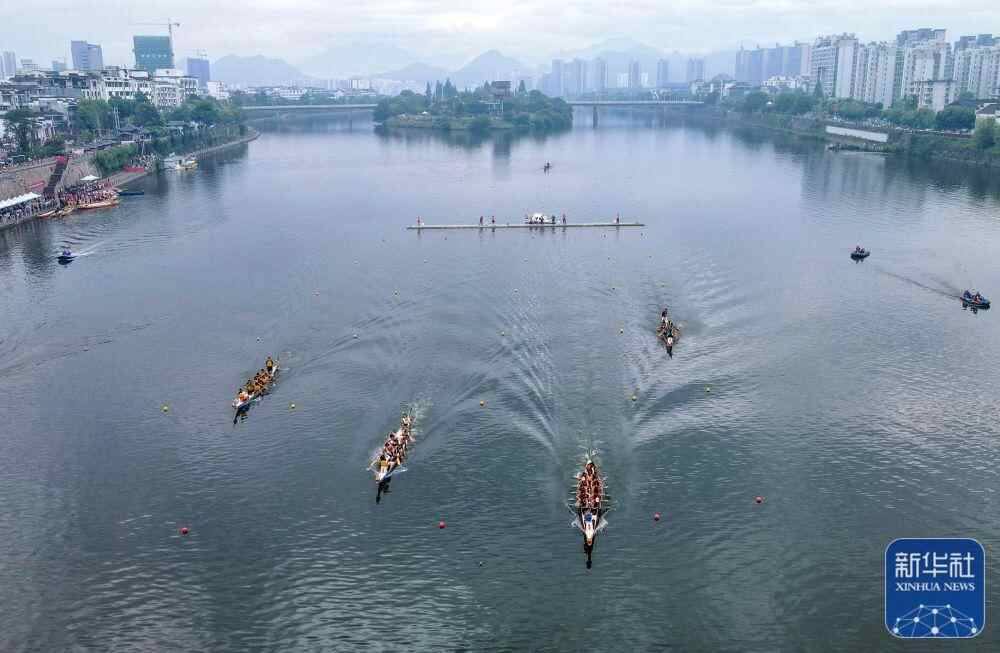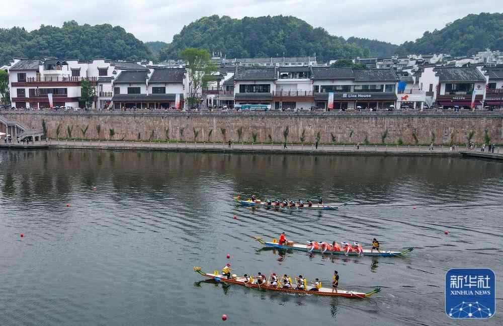 ↑ 6月18日,龙舟队在安徽省黄山市屯溪区新安江水域上展开角逐。新华社发(樊成柱摄)