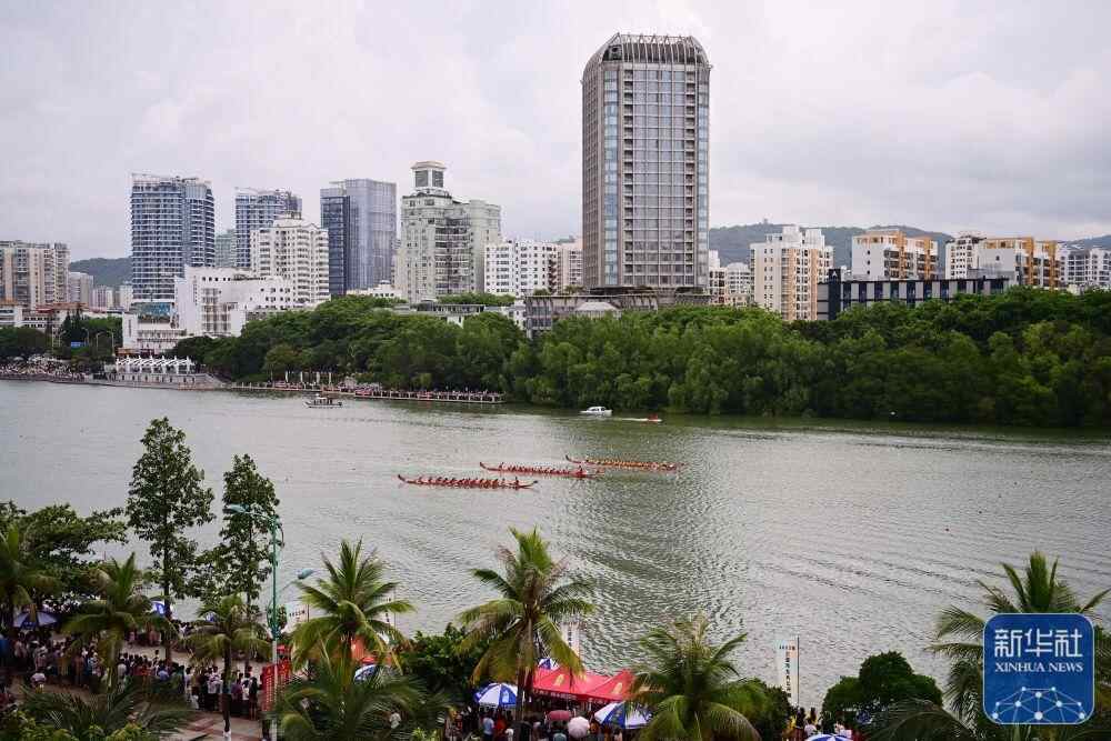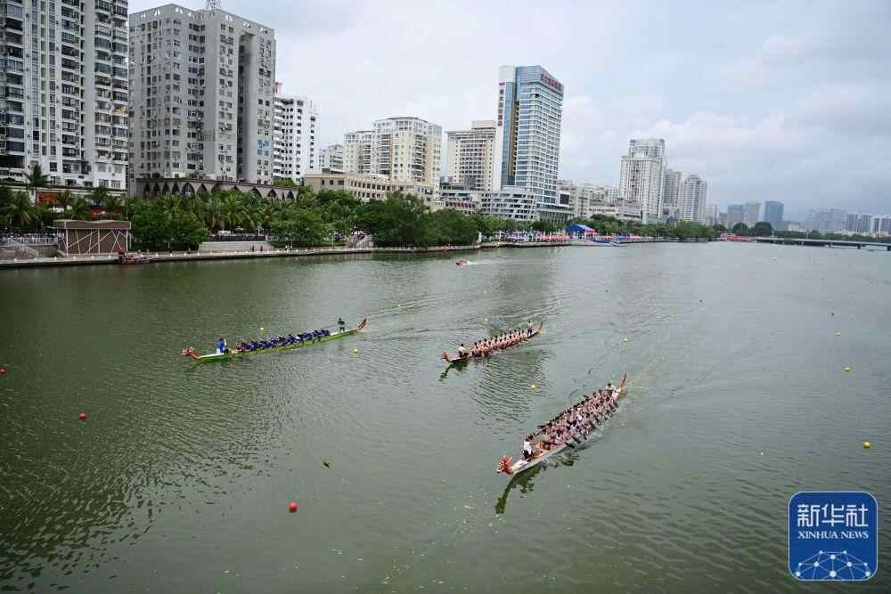 ↑ 6月18日,龙舟队在海南省三亚市三亚河上进行比赛。新华社发(沙晓峰摄)