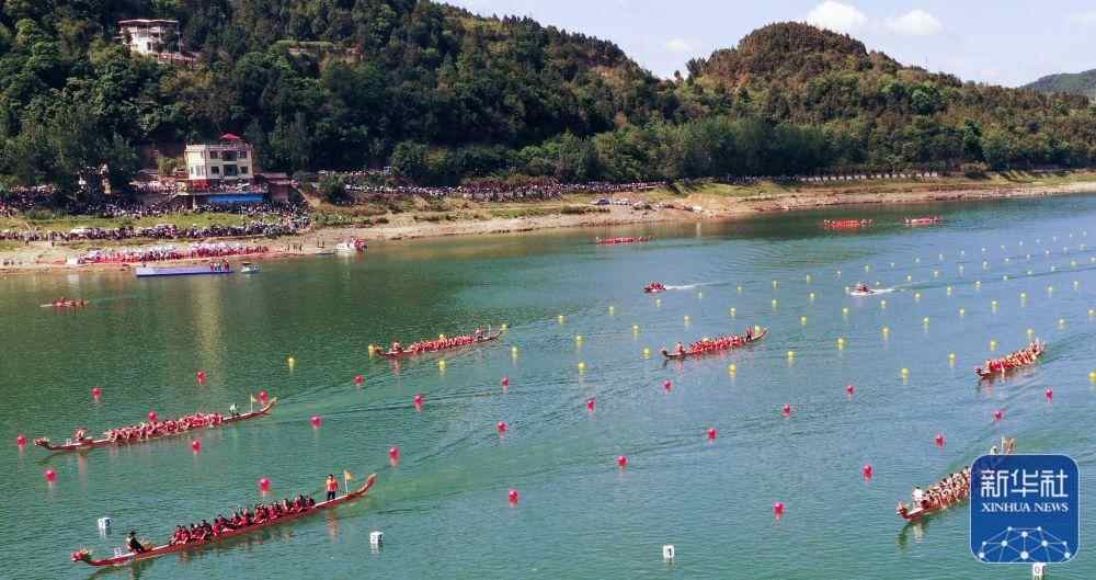 ↑ 6月18日,龙舟队在四川省南部县升钟湖参加比赛。新华社发(张枥摄)