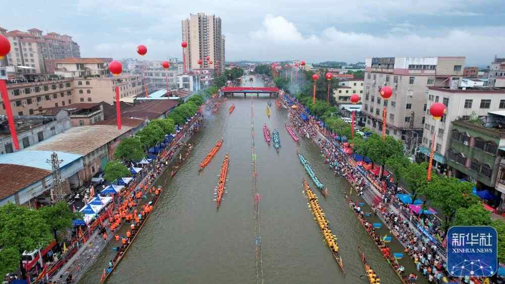 ↑6月18日,龙舟队在广东省肇庆市高要区金利镇西围涌参赛。新华社发(刘春林摄)