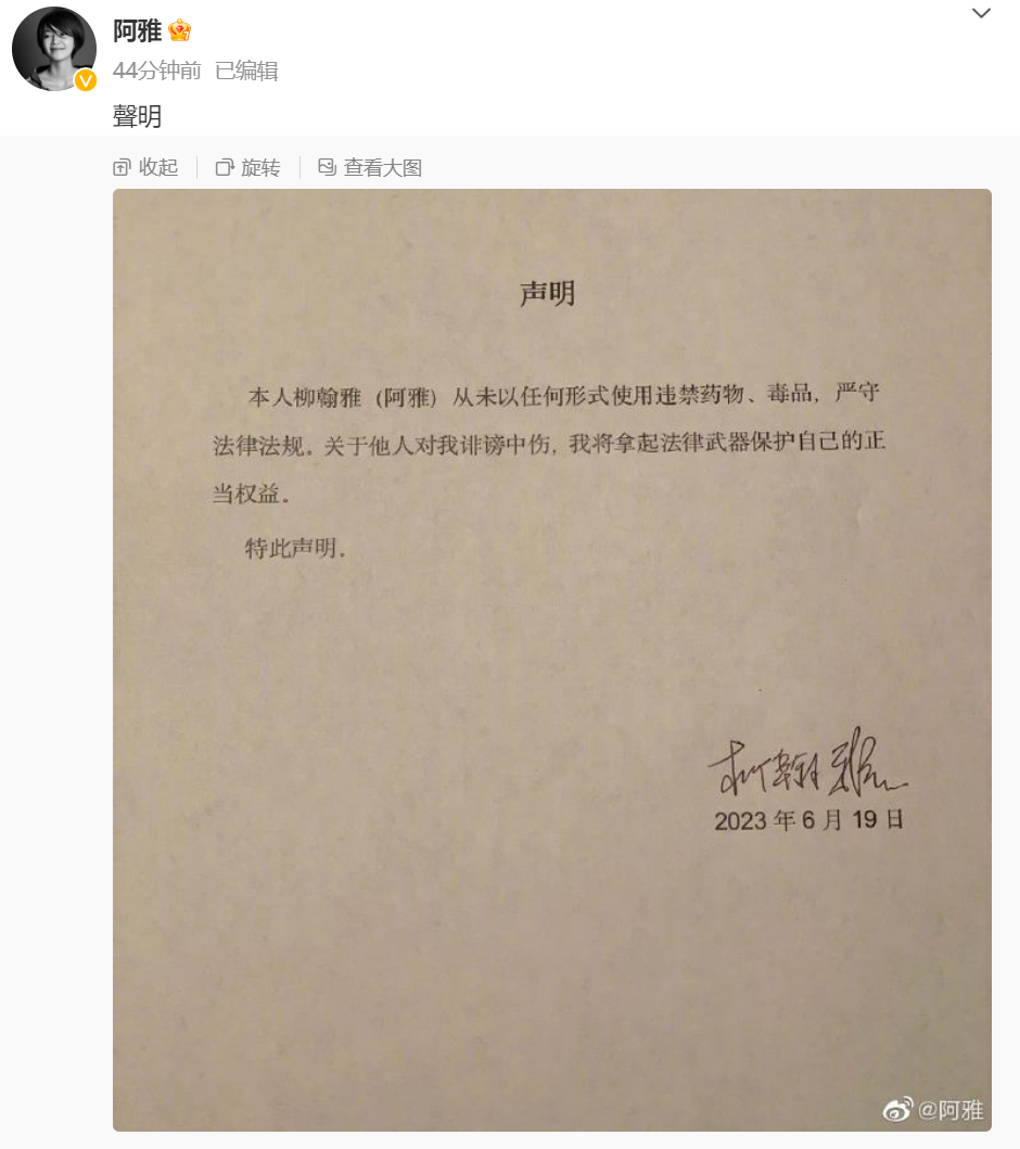 今天下午,阿雅在微博发布声明回应:“本人从未以任何形式使用违禁药物”,“关于他人对我诽谤中伤,我将拿起法律武器保护自己的正当权益。”