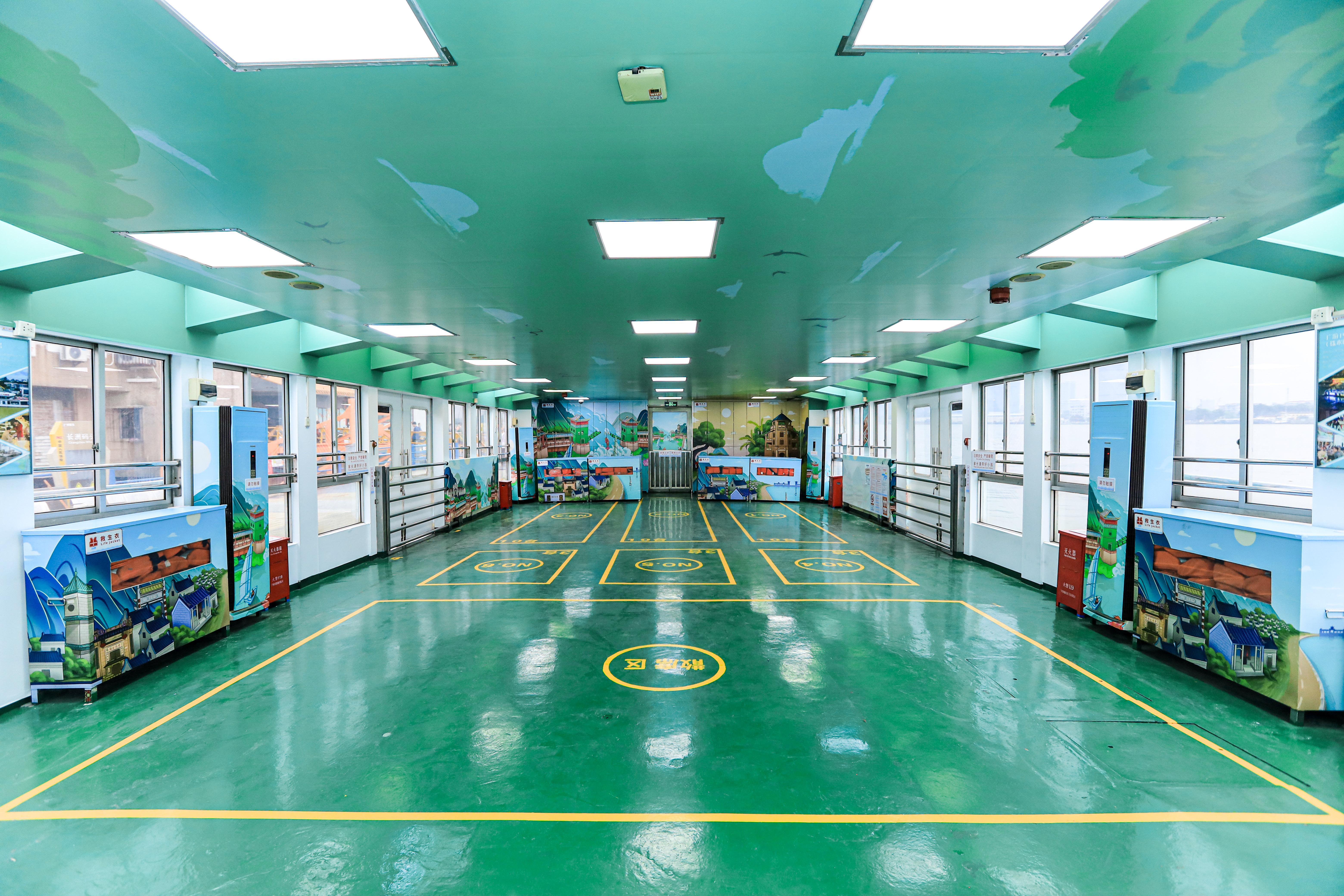 主题船舶外立面绘制了“慢岛廊桥”“军校风光”两幅手绘文化图,以船舶作为移动展示平台,向每位市民乘客直观展示长洲岛“珠江国际慢岛”风光。船舱内装饰也进行了主题化设计,船顶天花板采用了来自中山公园的生态绿洲景观贴画,船柱悬挂珠江文化宣传画,市民乘客在搭乘主题船时,能沉浸式感受“珠江国际慢岛”的魅力。