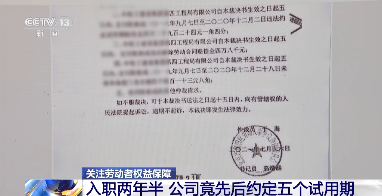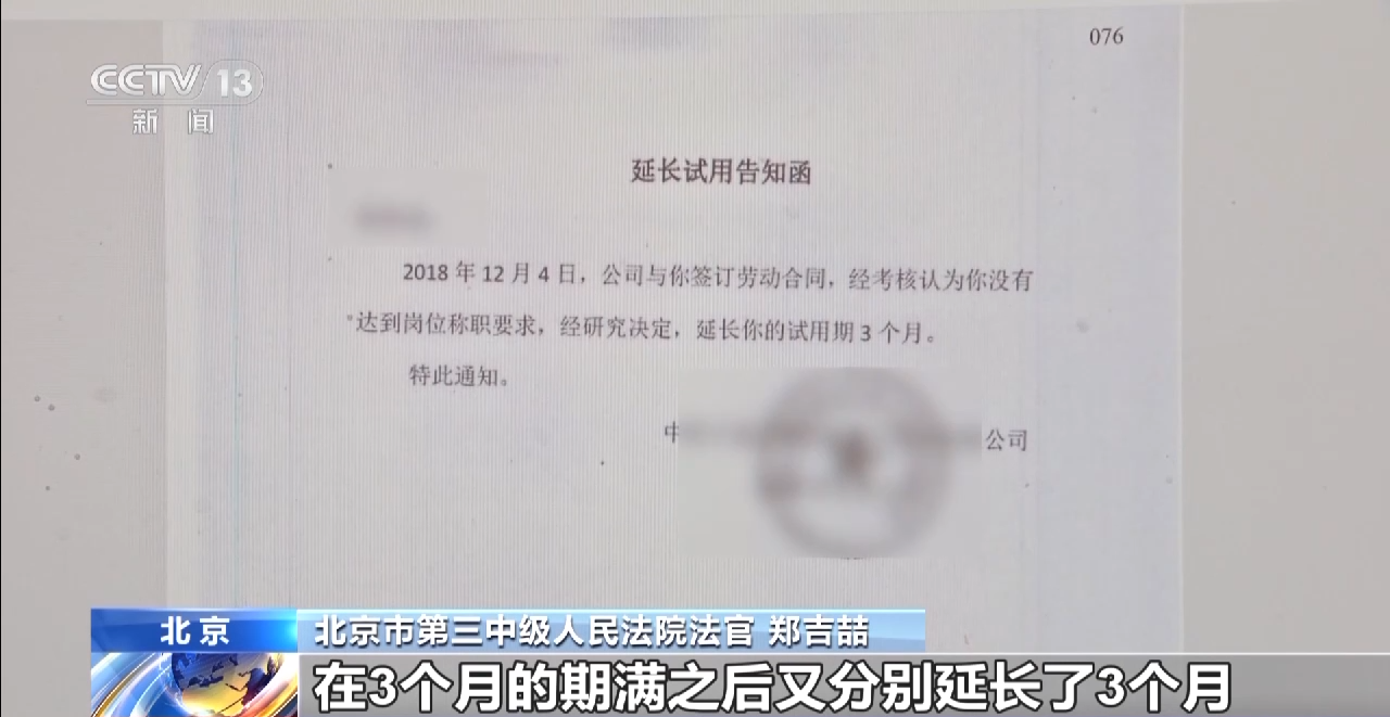 北京市第三中级人民法院法官 郑吉喆:后来,这个工程公司就如此往复,先后一共5次跟陈先生都签订了3年期的劳动合同,其中5份合同里有4次约定了3个月的试用期,在3个月的期满之后又分别延长了3个月,还有一份合同直接约定了6个月的试用期。