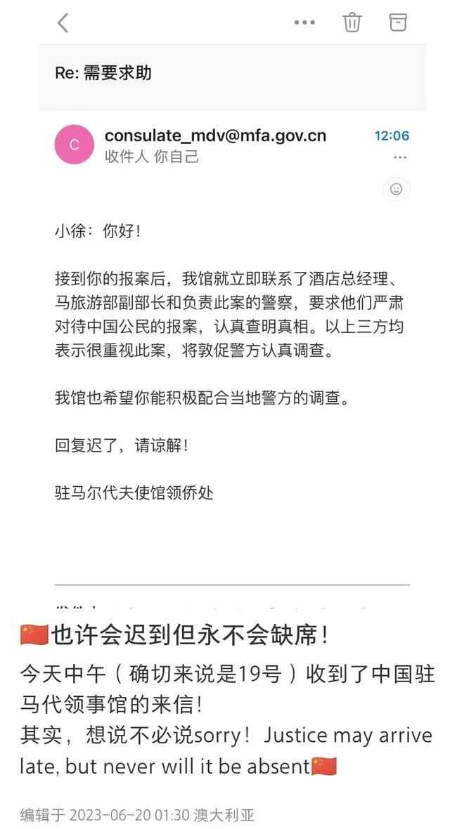 6月20日,受害女生称19日中午收到了中国驻马尔代夫领事馆的来信,信中称该馆接到女生报案后,立即联系了“酒店总经理、马旅游部副部长和负责此案的警察,要求他们严肃对待中国公民的报警,认真查明真相。以上三方均表示很重视此案,将敦促警方认真调查。我馆也希望你能积极配合当地警方的调查。”